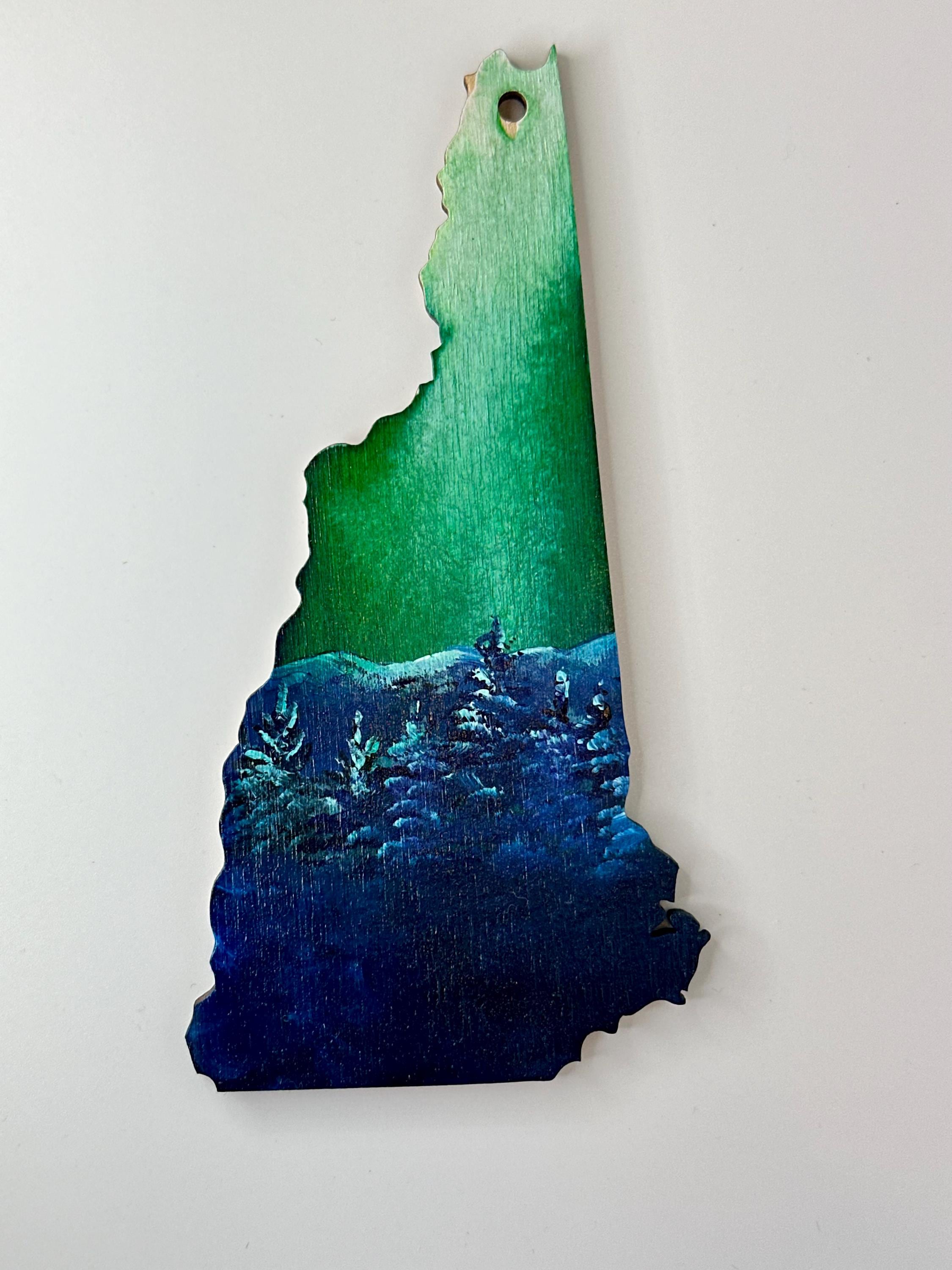 The 2026 ornament collection is here! Embrace the magic of the season with my hand-painted New Hampshire woodcut ornaments. Each 5-inch piece features a one-of-a-kind wintry scene inspired by the Northern Lights, thoughtfully hand-painted and finished with a protective varnish. No two ornaments are the same, making each one truly unique. Each ornament is ready to hang with decorative twine, perfect for adorning your tree or gifting to loved ones.
