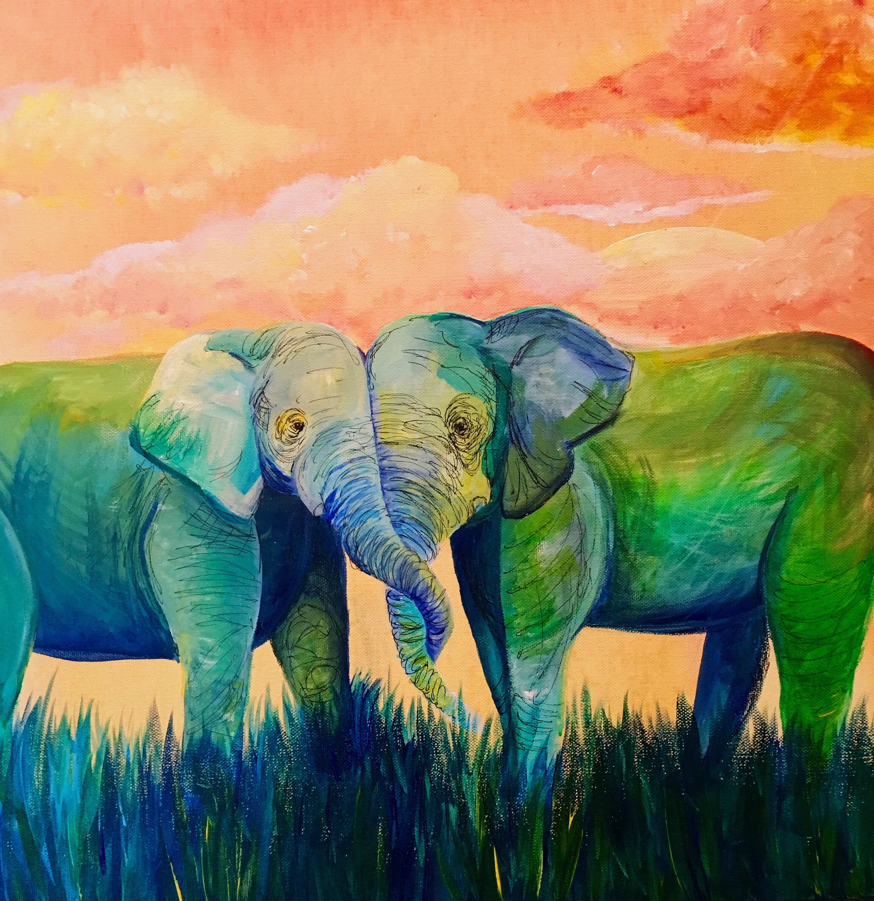 A former student asked for a pair of elephants for her father's birthday, so much fun was had with these bright colors! The original was created using acrylics on canvas.